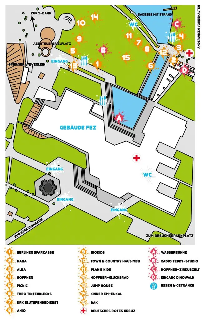 Es gibt zwei Ein- bzw. Ausgänge: Einen an der Freitreppe des FEZ, einen am Spielplatz. Bitte schau auf den Plan, um die Ein- und Ausgänge zu finden.
